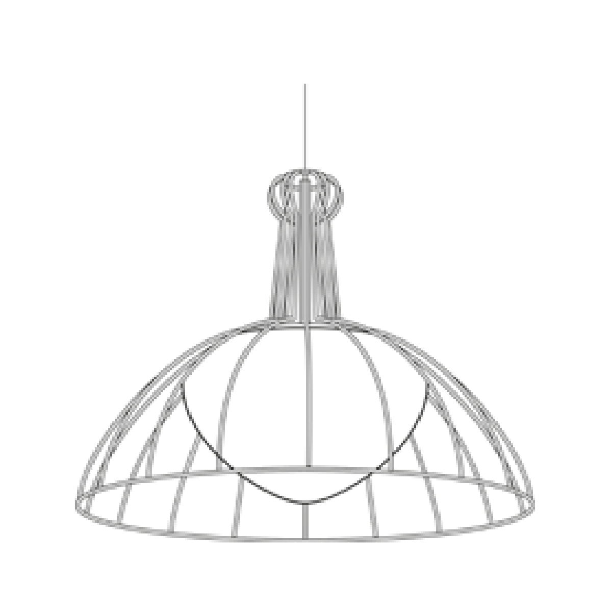 I fili della sua gabbia formano un paralume metallico dalle linee tondeggianti.