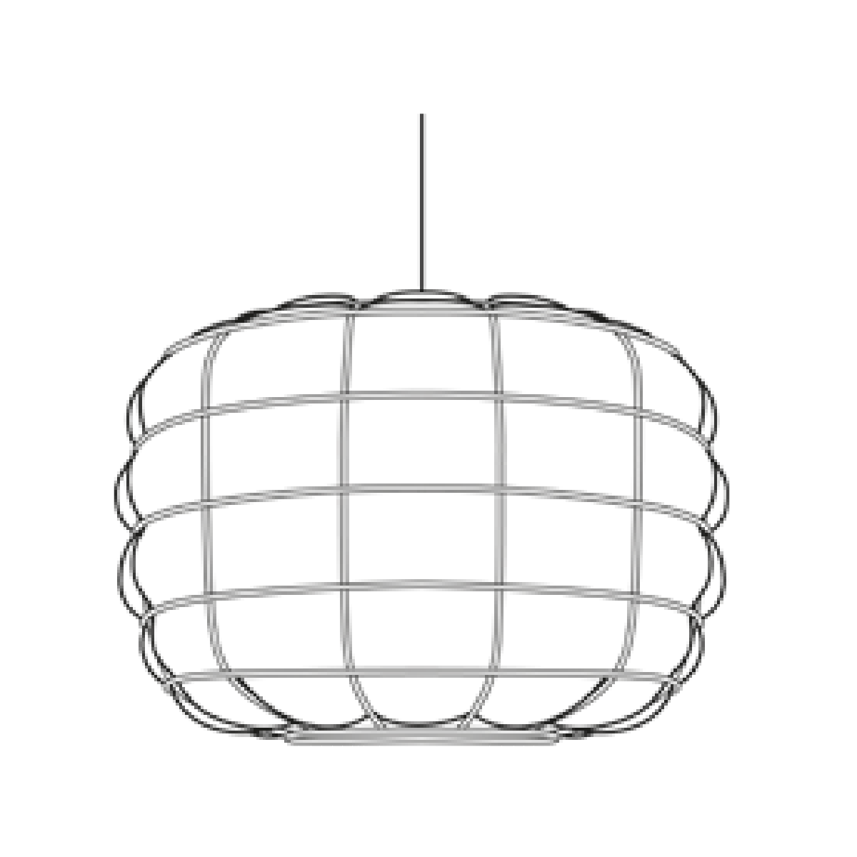 Filamenti di ferro che contengono dolcemente il soffio del mastro vetraio prendono spunto da meridiani e paralleli. Circonferenze metalliche che modellano la forma soffice di questa sfera compressa ai poli, che si plasma seguendo il percorso della gabbia. Quest’ultima, in metallo, segue linee simmetriche e precise: esagoni e rombi che si espandono e si distribuiscono sulla superficie vetrosa creano affascinanti pattern di ombre sull’ambiente circostante.