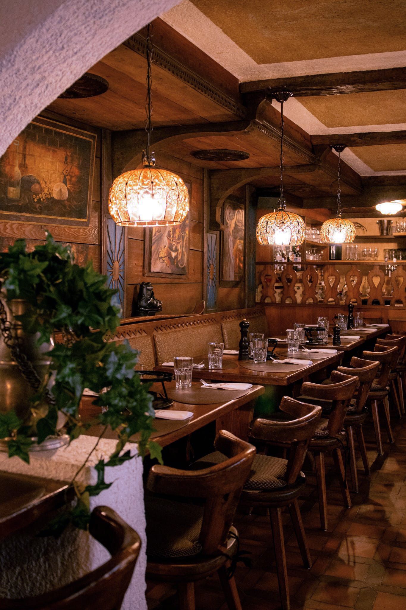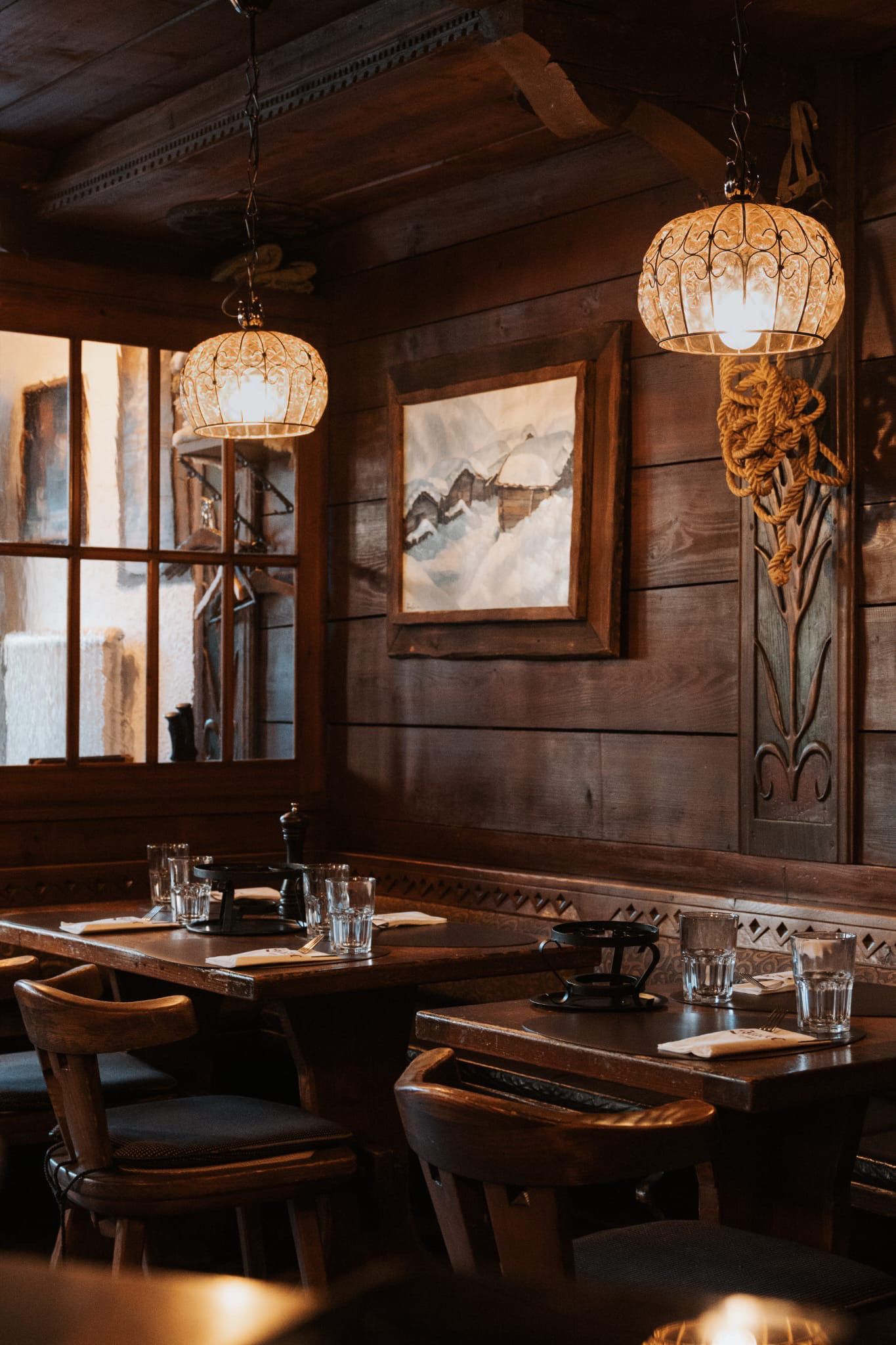 Per esaltare l’atmosfera calda, accogliente e ricca di carattere che da sempre contraddistingue il locale, sono state scelte le nostre lampade a sospensione San Tomà. Realizzate secondo l’antica arte della soffiatura del vetro veneziano, queste lampade si distinguono per le loro superfici in vetro finemente lavorate e per le eleganti strutture geometriche. Il loro design, sobrio ma sofisticato, si integra perfettamente con l’arredamento tradizionale del ristorante, contribuendo a creare un ambiente armonioso, raffinato e dal fascino senza tempo.