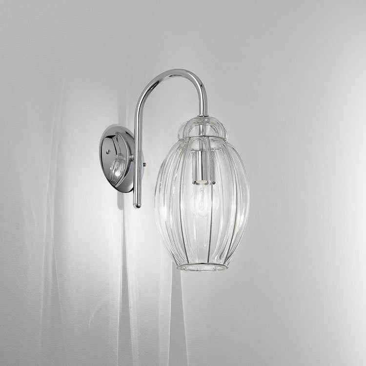 Le lisce facce esterne del suo corpo in vetro soffiato trasparente accennano a voler uscire dalla sua esile gabbia, consentono un chiarore etereo e generano una rifrazione diretta ma delicata.